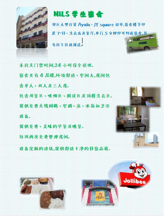 邻近大型百货Ayala、JY square超市,宿舍楼下及是7-11、洗衣店及餐厅,步行5分钟即可到达宿舍,另有提供校车往返接送。